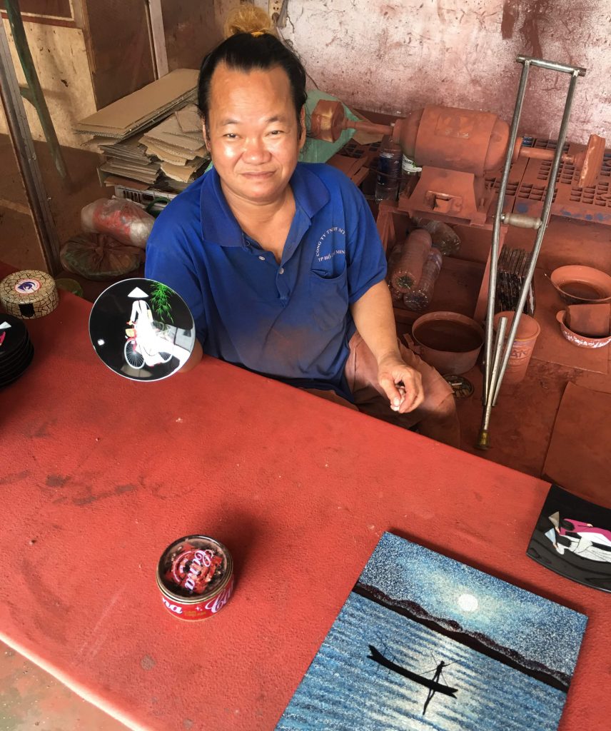 Ale k výletu. Nejdříve nás průvodce vezl do továrny pro hendikepované, kde jsme si mohli prohlédnout výrobu tradičních obrázků z rýže, skořápek, perleti z mušlí apod. A následně pak mohli přispět koupí dílka a finančně tak pomoci. Používané bojové plyny za války totiž nejen zabíjeli, ale poškozovali také genetiku a tak dochází již po několik generací k rození dětí s tělesní poškozením z těchto důvodů. Tedy nic veselého, snad jediné. Nechybělo moc a Oleks si svůj obraz v hodnotě víc jak tisíc korun, málem nechal v bufetu na stolku. Na ty jeho vytřeštěné oči, když jsem ho na to upozornil, jen tak nezapomenu. Obrázek stále má.
