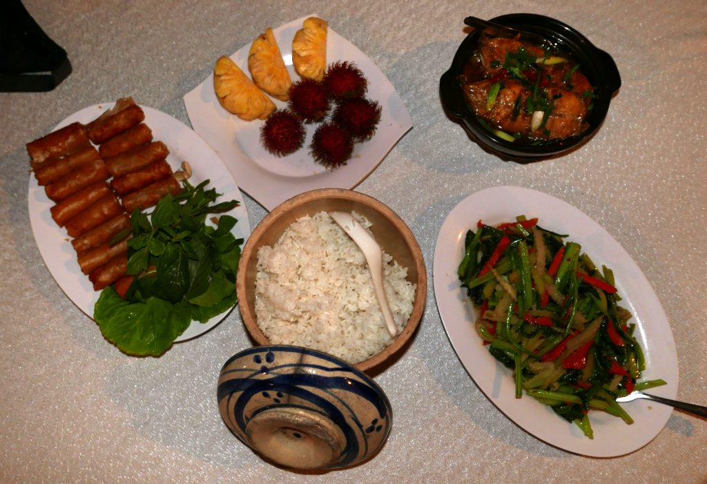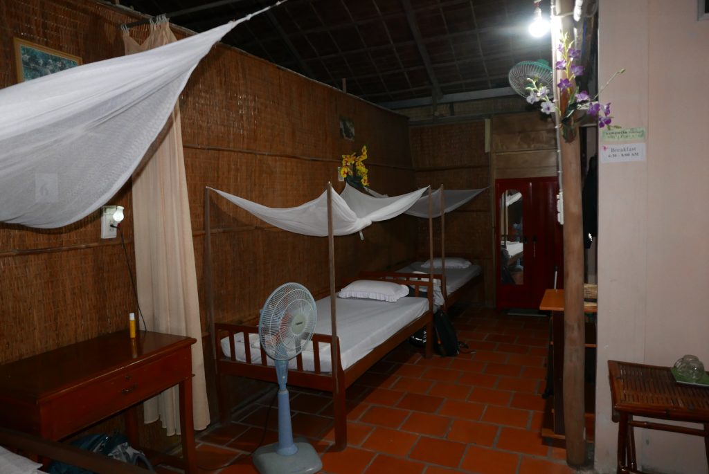 Dorazili jsme na ubykaci a začínal jsem si říkat, jestli jsme to s tím zkoušením života domácích nějak nepodcenili. Komáři, brouci, pavouci se všude jen hemžili. Od sousedů kokrhali kohouti. Ze tří společných sprch jen v jedné tekla teplá voda. No nic je večer, snad to dáme. Ovšem všechny obavy opadli s večeří. Ta sice nebyla nikterak levná, zato ovšem šlo spíše o hostinu než večeři. Donesli nám snad sedm chodů, všechno opravdu domácí kvalita a poctivé Vietnamské jídlo. Odcházeli jsme na kutě s plnými bříšky a trnuli co uvidíme po rozbřesku v okolí.