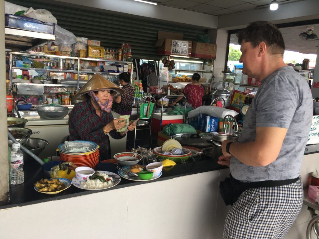 S batohy běhat někde po předměstí se nám nechtělo a tak jsme se uvelebili v klimatizované čekárně autobusáku. Naproti čekárně byl bufítek s hotovkami za příznivé ceny. Začíná tu platit, čím je jídlo levnější, nejde tím o jídlo pro turisty a je mnohem, mnohem chutnější. Já si dal nějaké maso s rýží (pes to nebyl), k tomu jsem dostal nakládané vejce a Lucka žabí stehýnka. Vše skvěle ochucené, oblizoval jsem se až za ušima za toto jídlo jsem platil v přepočtu 40,-Kč! 🙂 Ono přepočet na koruny je tu snadný, jelikož Vietnamský dong je 1.000:1 ke koruně (tz.:40.000 VND = 40,-Kč). A to jsou snadné počty 🙂