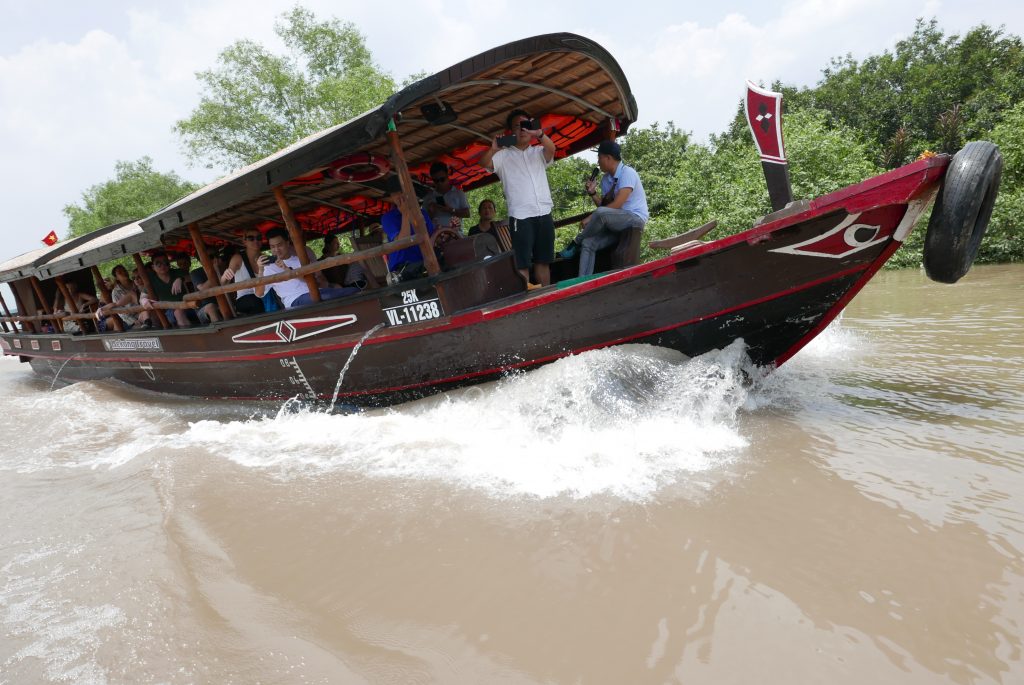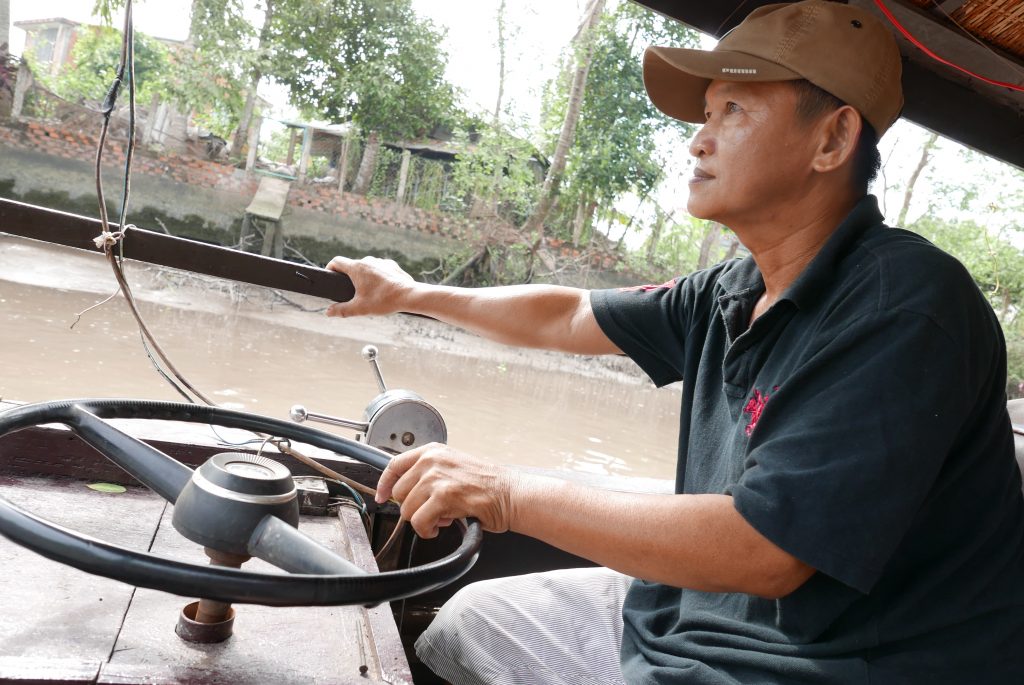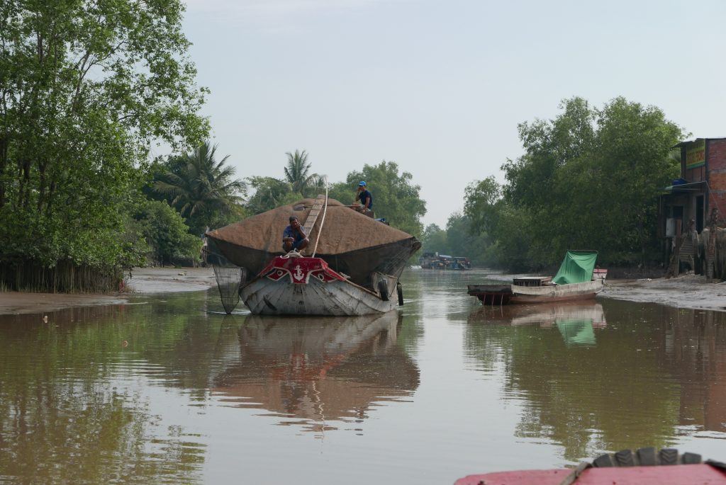 Po snídani, nebo spíše královské hostině o několika chodech, jsme vyrazili s místním průvodcem na loď po řece Mekong. Než jsme vůbec přišli k lodi průvodce už nás upozorňoval, že teď je nízká hladina. A opravdu hned v prvním kanále jsme se míjeli s ostatními loděmi na milimetry. Nikdo nechtěl ke kraji aby riskoval, že zůstane do oběda břichem lodi píchnutý do dna. Ostatně takto poškozené větší lodě jsme v tom kanále objížděli. A co s tím dělali majitelé lodí? Nic, lehli si do sítě a čekali až bude zase vody víc 🙂 . No stres.