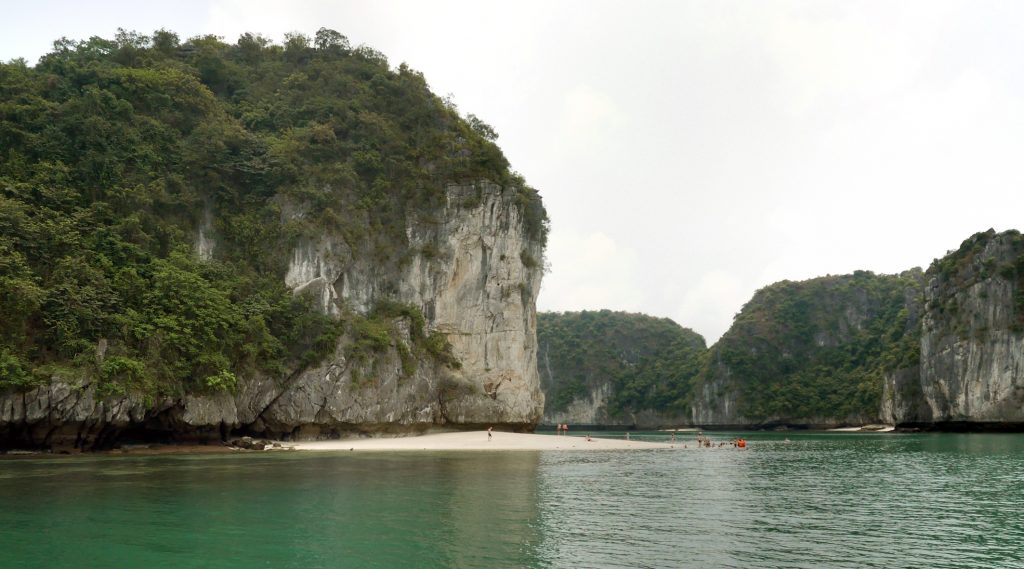 Po obědě jsme se zastavili u ostrůvků, které měli malé písečné plážičky. Sice pěkné plážičky, ale molo žádné. A tak chceš-li se koupat, tu máš šnorchl, brýle a chceš-li tak šup, hup, skoč z lodi. Já se šel nejdříve kouknout na žebřík, po kterém se dalo vylézt zpět na loď (v Asii nikdy nevíte 🙂 ). Po ujištění, že žebřík je na mou postavu dostatečně nosný jsem do vody skočil také a plaval na pláž.